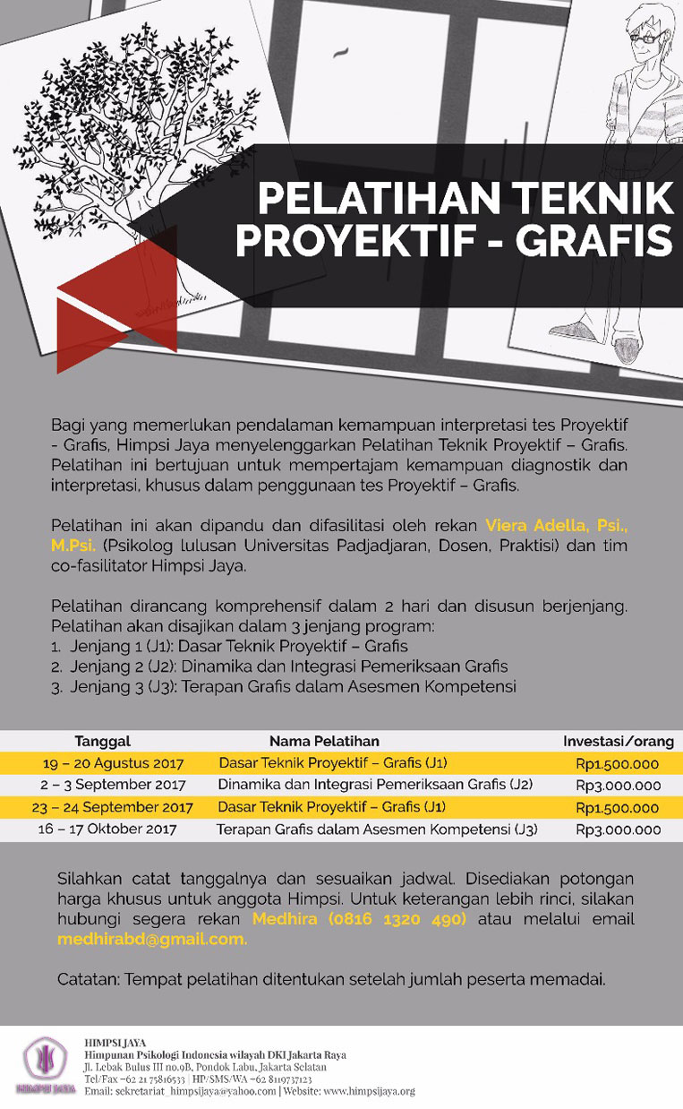 Bagi yang memerlukan pendalaman kemampuan interpretasi tes Proyektif – Grafis, Himpsi Jaya menyelenggarakan Pelatihan Teknik Proyektif – Grafis. Pelatihan ini bertujuan untuk mempertajam kemampuan diagnostik dan interpretasi, khusus dalam penggunaan tes Proyektif – Grafis.