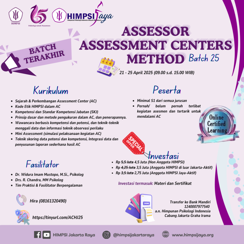 HIMPSI medan kembali menyelenggarakan pelatihan Assessor Assessment Center Method (Batch 25) bersertifikat secara online, ber-SKP HIMPSI, bagi calon Asesor yang berlatar belakang pendidikan Psikologi dan Non Psikologi, untuk meningkatkan kompetensinya sebagai Assessor Assessment Centers Method .