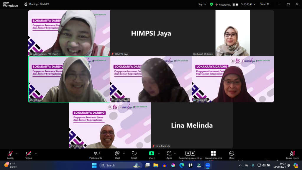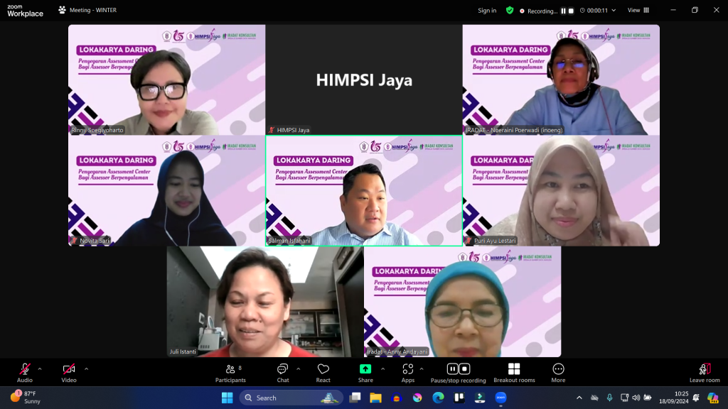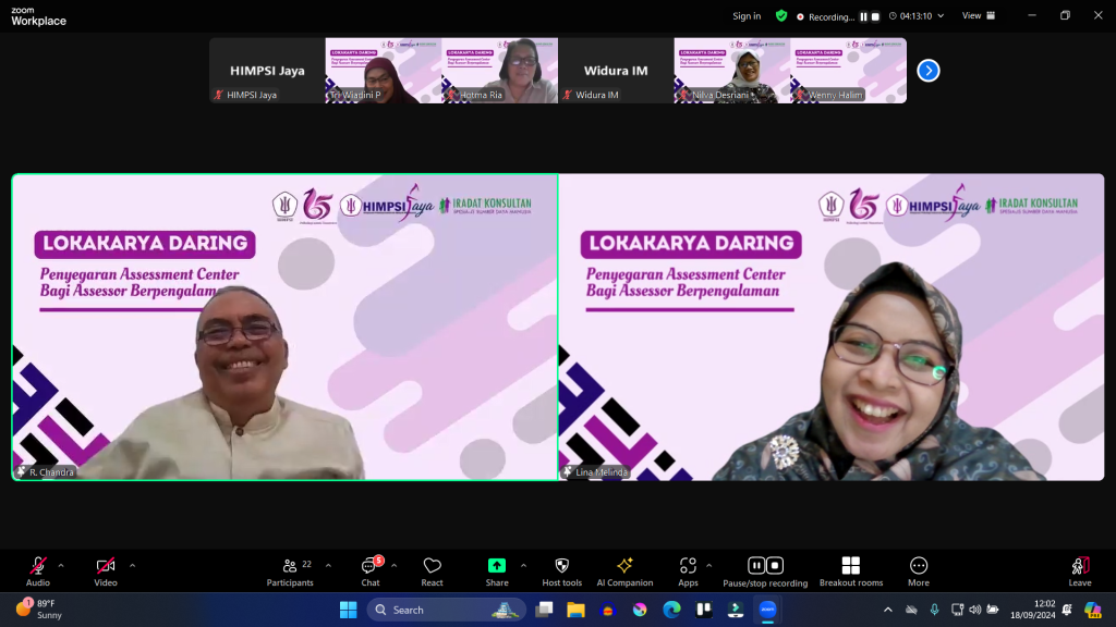 HIMPSI Jakarta Raya (HIMPSI Jaya) bekerja sama dengan Iradat Konsultan sukses menggelar Lokakarya Daring Penyegaran Assessment Center Bagi Assessor Berpengalaman pada 17-19 September 2024. Lokakarya daring ini diikuti oleh anggota HIMPSI dari berbagai wilayah di Indonesia. Setiap peserta yang memenuhi persyaratan akan mendapatkan Satuan Kredit Profesi (SKP) resmi dari HIMPSI.